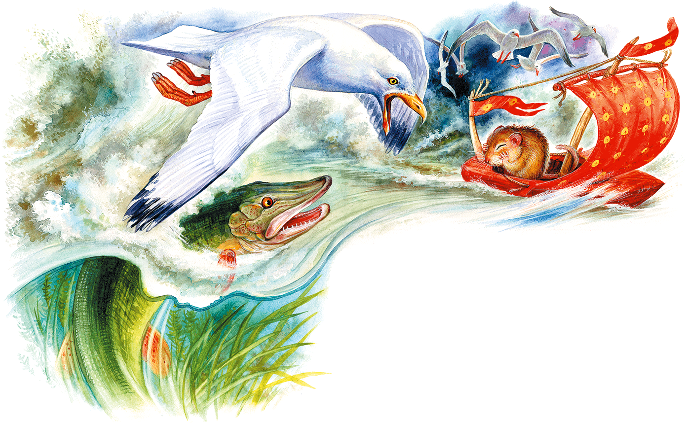 А со дна реки поднялась щука и тоже поплыла за корабликом. Она ждала, когда чайки скинут мышонка в воду. Тогда ему не миновать её страшных зубов.