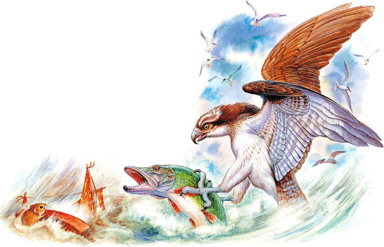 В это время сзади подлетела крупная хищная птица – рыболов-скопа. Чайки бросились врассыпную.