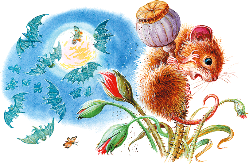 А над макушками высоких трав уже всходила полная луна. Быстрые тени бесшумно проносились в воздухе: это гонялись за ночными бабочками вёрткие летучие мыши. Тихие шорохи и шелесты слышались со всех сторон в траве. Кто-то копошился там, шмыгал в кустах, прятался в кочках.