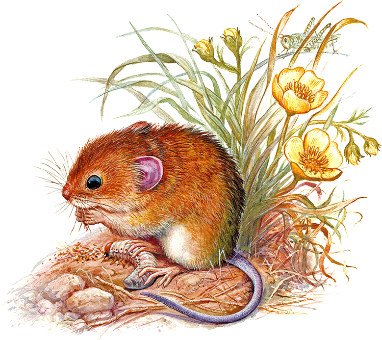 Луг был сухой. Змеи не попадались. Мышонок расхрабрился, стал путешествовать и при солнце. Ел он теперь всё, что ему попадалось: зёрна и клубни разных растений, жуков, гусениц, червей. А скоро научился и новому способу прятаться от врагов.
