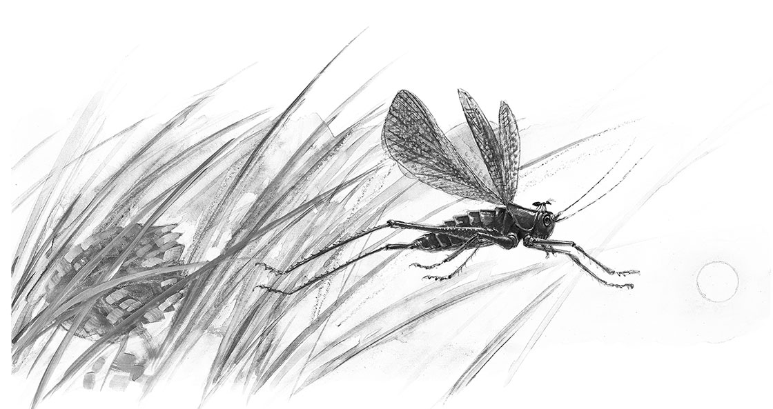 Приземлился – и кувырк! Эх, какой неловкий! Упал навзничь. Растянулся на земле во весь свой длинненький рост… А ножки-то коротенькие, не достать ему до земли, не перевернуться. Кружится на спине.