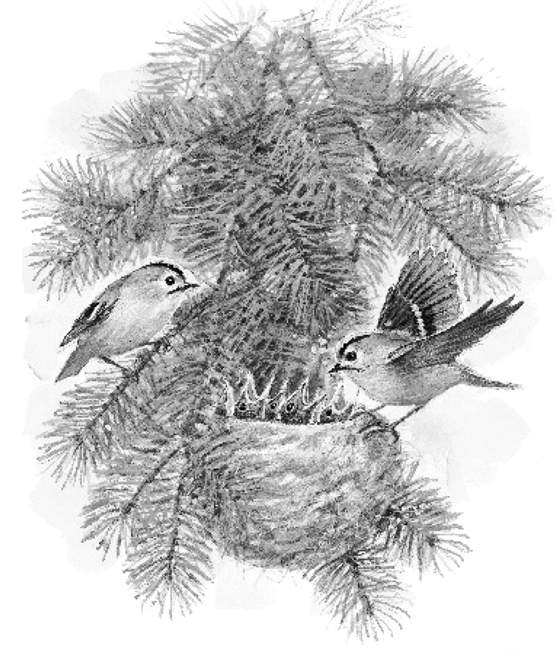 Совам казалось снизу, что на широкой еловой лапе перепутались в клубок мелкие веточки. Им и в голову не приходило, что в этом клубке было уютное круглое гнездо из мха, стебельков травы и крепкого конского волоса. Сверху корольки убрали гнездо еловым лишайником, в стенки вплели тонкие паутинки, а внутри выстлали пёрышками; на эту мягкую подстилку самка отложила восемь розовых с бурыми крапинками яичек, величиной с горошину.
