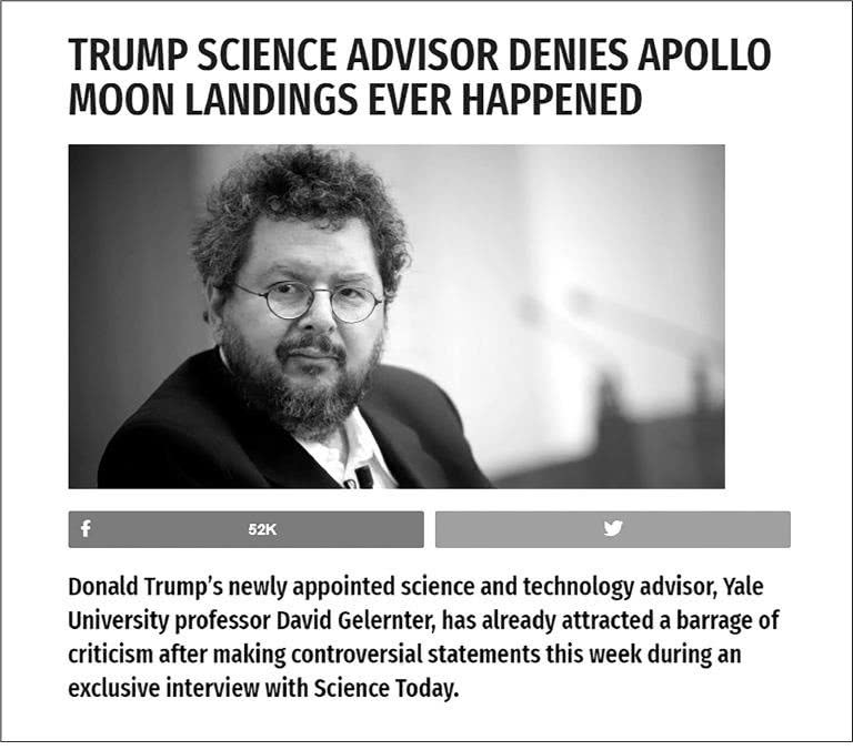 В тексте приводилась цитата из интервью «новоназначенного советника президента Дональда Трампа по науке и технологиям, профессора Йельского университета Дэвида Гелернтера»: