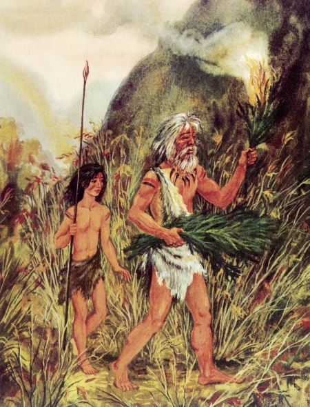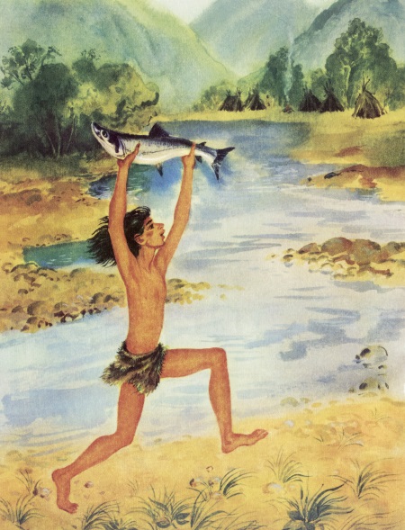 Это было давным-давно, когда ещё никто не умел выращивать хлеб и строить дома из дерева или камня. Среди зелёных холмов, у прозрачной речки, стояло десятка два шалашей, обтянутых звериными шкурами. В них жило племя, которое называло себя просто – «люди». Женщины этого племени собирали съедобные плоды и коренья, а мужчины охотились на оленей, бизонов и других зверей. Дети тоже не сидели без дела – девочки помогали матерям, мальчики учились охотничьему делу.