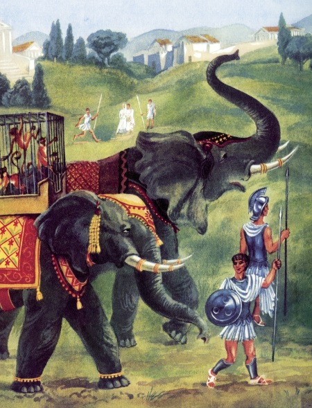 …Однажды утром афиняне испугались, услышав в гавани грозный рёв. Может быть, это напали враги? Отовсюду бежали люди – кто с мечом, кто с копьём. Но, выбежав на дорогу, ведущую к морю, они изумлённо останавливались. Навстречу им шли огромные серые чудовища, похожие на движущиеся горы. То одно, то другое поднимало кверху похожий на трубу хобот и гулко трубило. Рядом шагали воины, смеясь над испугом афинян.