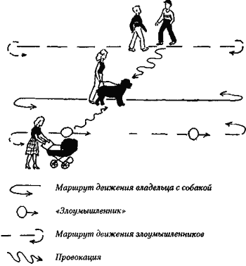 При применении второго варианта неожиданного обрыва очень полезно совмещение его с отработкой элемента защиты хозяина Последний располагается в 1 -2 метрах перед собакой, которую удерживает хелпер. Чтобы собака не отвлекалась на хелпера, ее внимание следует «переключить» на одного из «злоумышленников» Хелпер должен отпустить собаку через 2-3 секунды после начала схватки злоумышленника с хозяином Трудно переоценить значение упражнения «Тротуар» (рис 13) Владелец с собакой движется по прямой (отрезок 50 метров) Фигуранты (4-5 человек) произвольно движутся в двух направлениях, имитируя «прохожих» По очереди они набрасываются на владельца спереди, сзади и сбоку Особое внимание следует уделить «боковым» атакам, когда «злоумышленник» некоторое время движется рядом с собакой, затем – рядом с хозяином параллельным курсом.