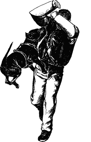 В этом упражнении самая ответственная часть – умение владельца работать поводком. Нужно всячески избегать рывков, а плавными движениями перемещать собаку в сторону (или назад) от ударов и тут же давать возможность атаковать в момент паузы между ударами (рис. 15).