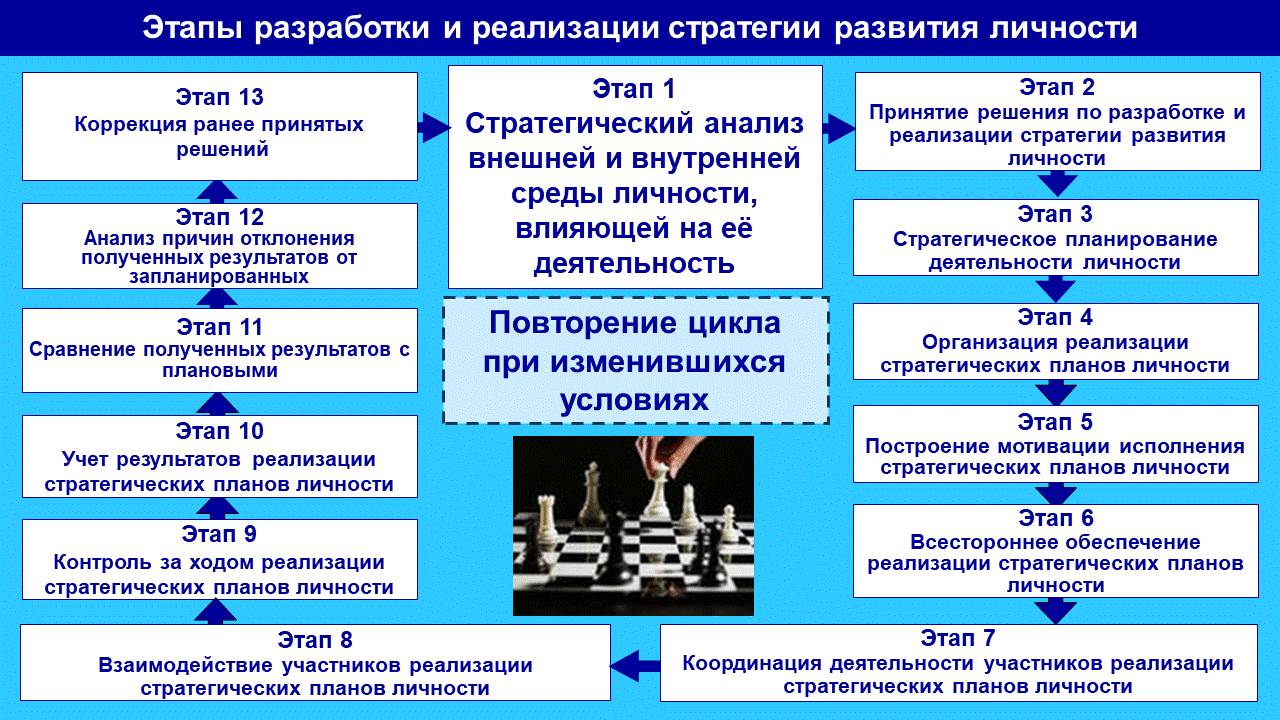 Этап 2. Принятие личностью решения по разработке и реализации стратегии развития личности. Например: весьма часто личность задумывается о необходимости разработки своей стратегии развития на определённом этапе жизненного пути: в процессе учебы, например, в школе, в среднем или высшем учебном заведении, в процессе трудовой деятельности, после выхода на пенсию, или, например в кризисные, тяжёлые периоды жизни.