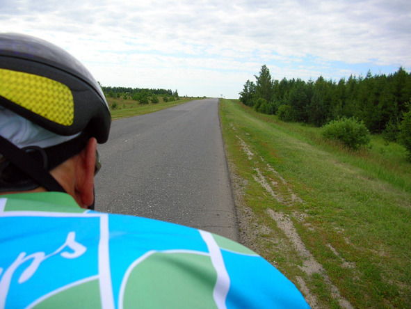 После Лопатино асфальтовое покрытие стало узким, но вполне терпимое его качество и полное отсутствие машин мало изменило наш ход. Скорость немного снизилась ещё и потому, что прошло стартовое возбуждение. Но отсутствие усталости вселяло уверенности в том, что делаем мы всё правильно. Замечаем, что стало очень жарко и создаваемый нами встречный ветерок почти не охлаждает.
