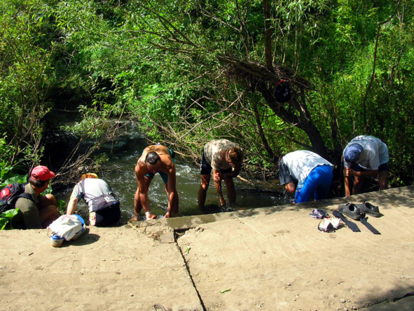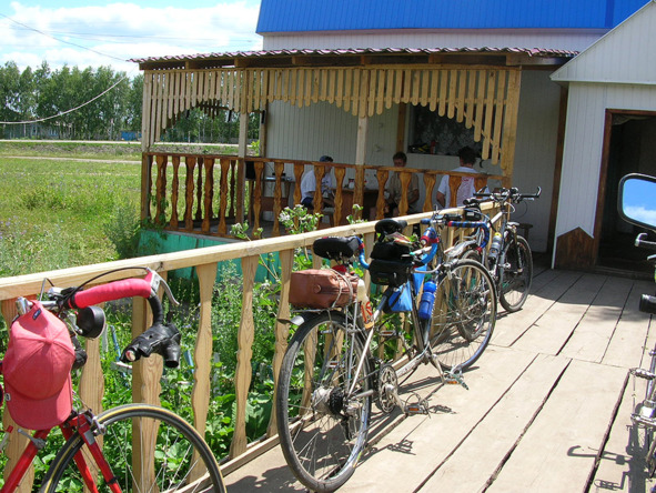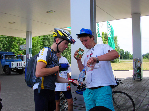 В течение 10 минут пополняем запасы воды, легко перекусываем. Подъезжает Дима. Быстро он заменил камеру и вернулся в группу! А когда мы уже тронулись дальше, подкатил Егор.
