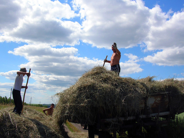 Только что скошенное и сбитое в стог сено перекрывает дорогу. Его ещё не успели перевезти в село. Здороваемся с косарями и обходим стог пешком. Короткий диалог: «Вы, не велике здоровья набираетесь, а мы, вот, на сене! Мы уважаем вас!» – «Мы вас тоже!», взбодрил обе стороны.