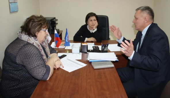 Глава Администрации гп Некрасовский С. И. Колков на приёме у Депутата Государственной Думы Российской Федерации И. К. Родниной. Обсуждаются актуальные вопросы развития поселения. Книга «От достойного прошлого – к счастливому будущему» – на столе у Ирины Константиновны (между флажками). 2016 г