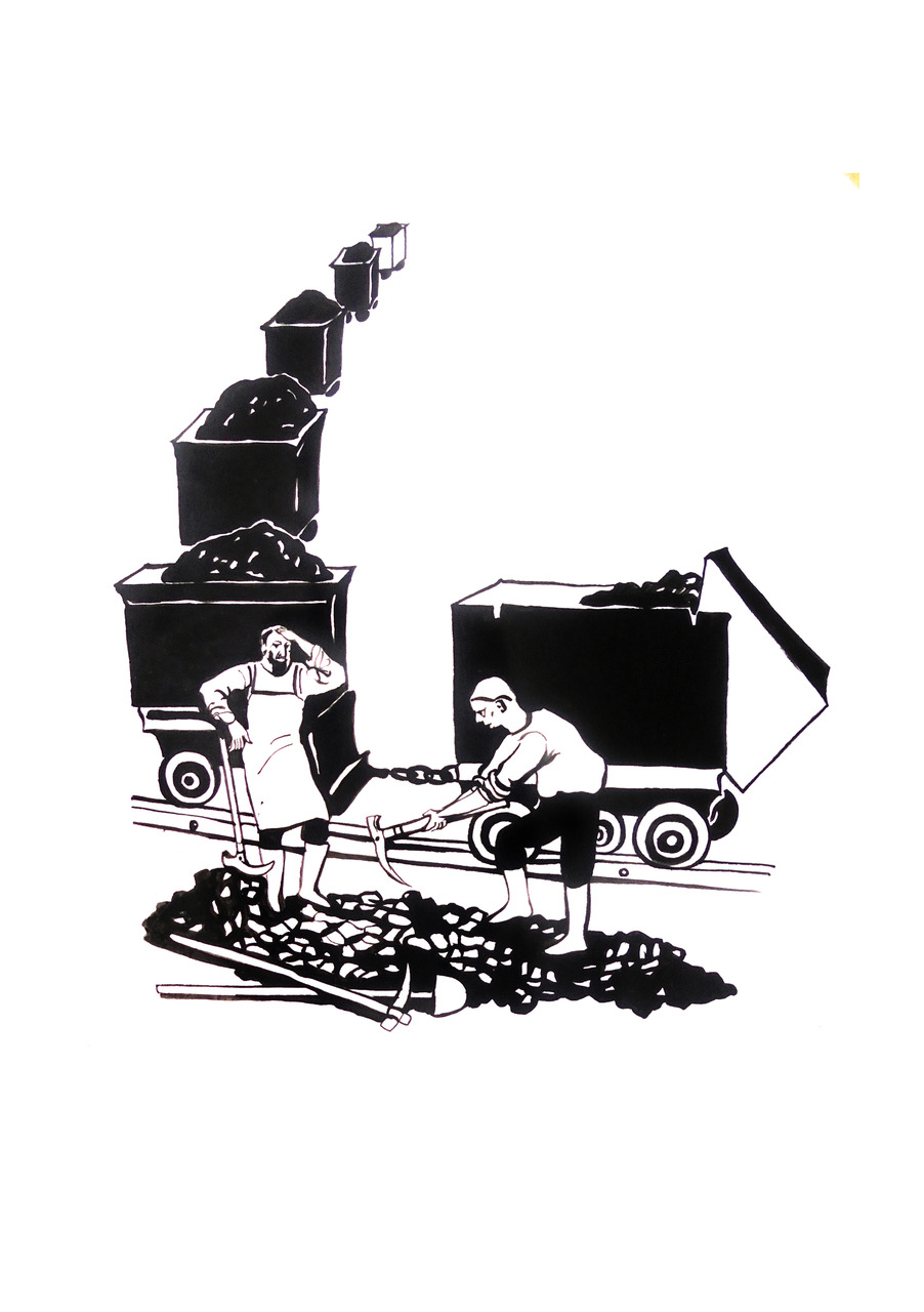 Нас много под землей,Среди руды железной.И труд у горнякаНадежный и полезный.И не дрожит рука,Единая с Киркою,И мы поглощеныЗемною глубиною.А где-то наверхуЗавод сталепрокатный,От нас он ждет руды,Работы результатной.И, уперев плечом,Толкаем вагонетки,Ведь к нам на рудникиНе ходят малолетки.Мужской, тяжелый труд —Порою и опасен.Но кто, если не мы? —И вывод сразу ясен!И снова на-гораИдут с рудою тачки,И подмигнем поройКакой-нибудь батрачке.И будет стали звон,И золото рекою!..А завтра на рудникС любимою Киркою.
