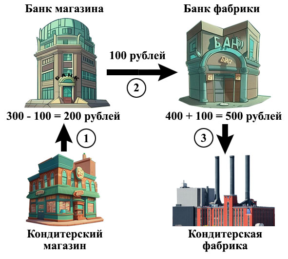На банковском счете кондитерского магазина 300 рублей, а на счете фабрики 400. Магазину надо перечислить на фабрику 100 рублей за покупку тортов. Магазин, конечно, предварительно должен узнать название банка, в котором фабрика хранит свои деньги, и номер ее банковского счета. Далее магазин сообщает своему банку, что он хотел бы перевести 100 рублей на счет фабрики в ее банк. Это у нас стрелка под номером 1.