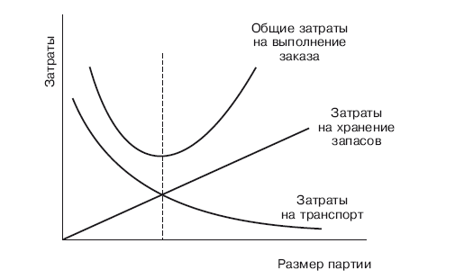 Оптимального соотношения интересов различных подразделений можно достичь на основе минимальных общих затрат. Пример минимизации общих затрат, в котором учитываются только затраты на хранение и транспорт, так как их удельный вес в общей структуре затрат значителен, приведен на рис. 1.3. В более сложных логистических моделях учитываются и другие составляющие.