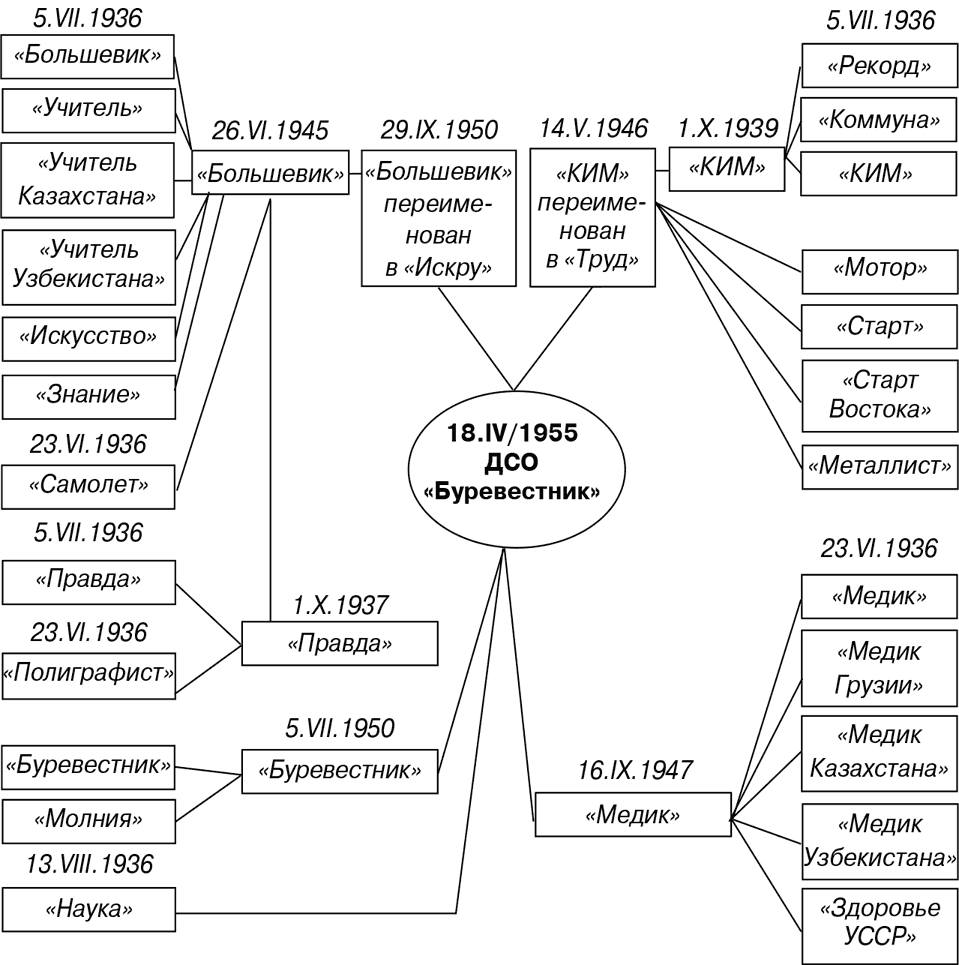 Здесь следует подчеркнуть, что в 1936–1956 гг. ДСО «Буревестник» объединяло работников профсоюзов госторговли, книжной торговли, потребкооперации, центра общественного питания и внешней торговли. Помимо ДСО «Буревестник» в 1936 г. были созданы и другие добровольные спортивные общества, организованные по отраслевому принципу.