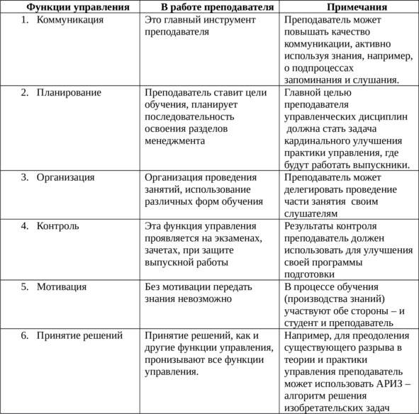 Ниже представлена таблица, где я перечисляю функции управления и иллюстрирую как эти функции проявляются в работе любого преподавателя менеджмента (и не только):