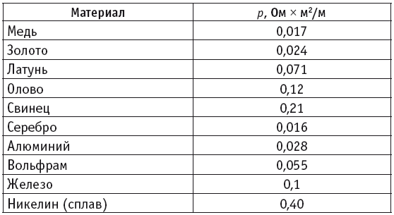 где коэффициент р называется удельным сопротивлением матерала проводника. Данный коэффициент выражает сопротивление проводника длиною в 1 м при площади поперечного сечения, равной 1 м2. Удельное сопротивление выражается в Ом × м. Поскольку провода, как правило, имеют довольно малое сечение, то обычно их площади выражают в квадратных миллиметрах. В этом случае единицей удельного сопротивления станет Ом × мм2/м.