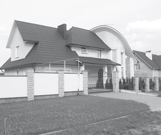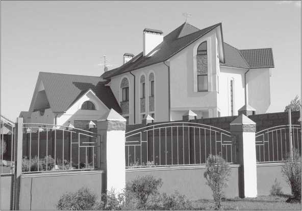 Вальмовая крыша существенно ограничивает возможности использования расположенного под ней пространства. Устройство надстройки здесь, скорее всего, продиктовано необходимостью естественного освещения помещений второго этажа. Угловой излом еще более усложняет форму крыши. Достаточно сложная стропильная система, дополнительный расход кровельных материалов, связанный с косой резкой черепицы, большое количество ендов, ребер и примыканий, а также фасонных изделий значительно увеличивают стоимость кровли. Видимо, такое архитектурное решение дома продиктовано вкусами его хозяина.