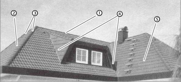 1 – конек; 2 – полувальма; 3 – ребра; 4 – выступающие прогоны; 5 – скат.