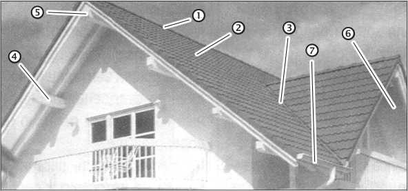1 – конек; 2 – скат; 3 – ендова; 4 – прогоны; 5 – коньковый брус; 6 – двухскатный козырек; 7 – карниз.
