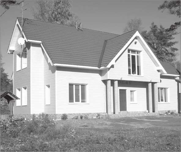 Полувальмовая крыша прекрасно вмещает под собой дополнительные жилые помещения, которые составляют 70 % от площади первого этажа. Конечно, такая конструкция несколько тяжеловесна, но в сочетании с легким балконом, изящными оконными переплетами и другими деталями ее можно признать вполне удовлетворительной.