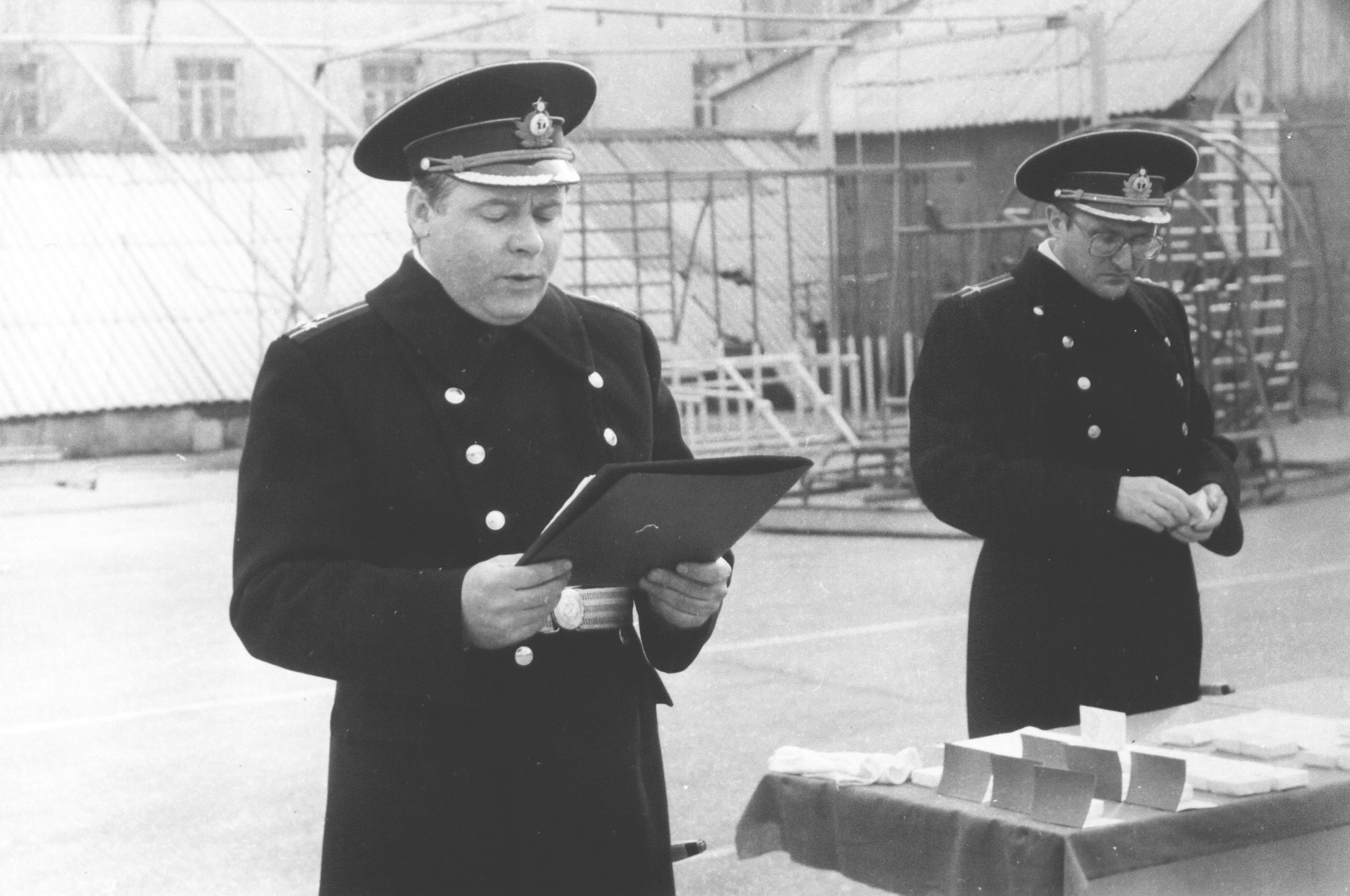 Зачитывание приказа о награждении. Слева начальник штаба153 бригады ПЛ капитан 1 ранга Владимир Аникин, справа начальник политотдела капитан 1 ранга Юрий Тарариев
