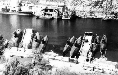 Плавпирсы с ошвартованными к ним подводными лодками в Балаклавской бухте. На заднем плане погружаемые стартовые комплексы для проведения испытаний подводного старта баллистических и крылатых ракет