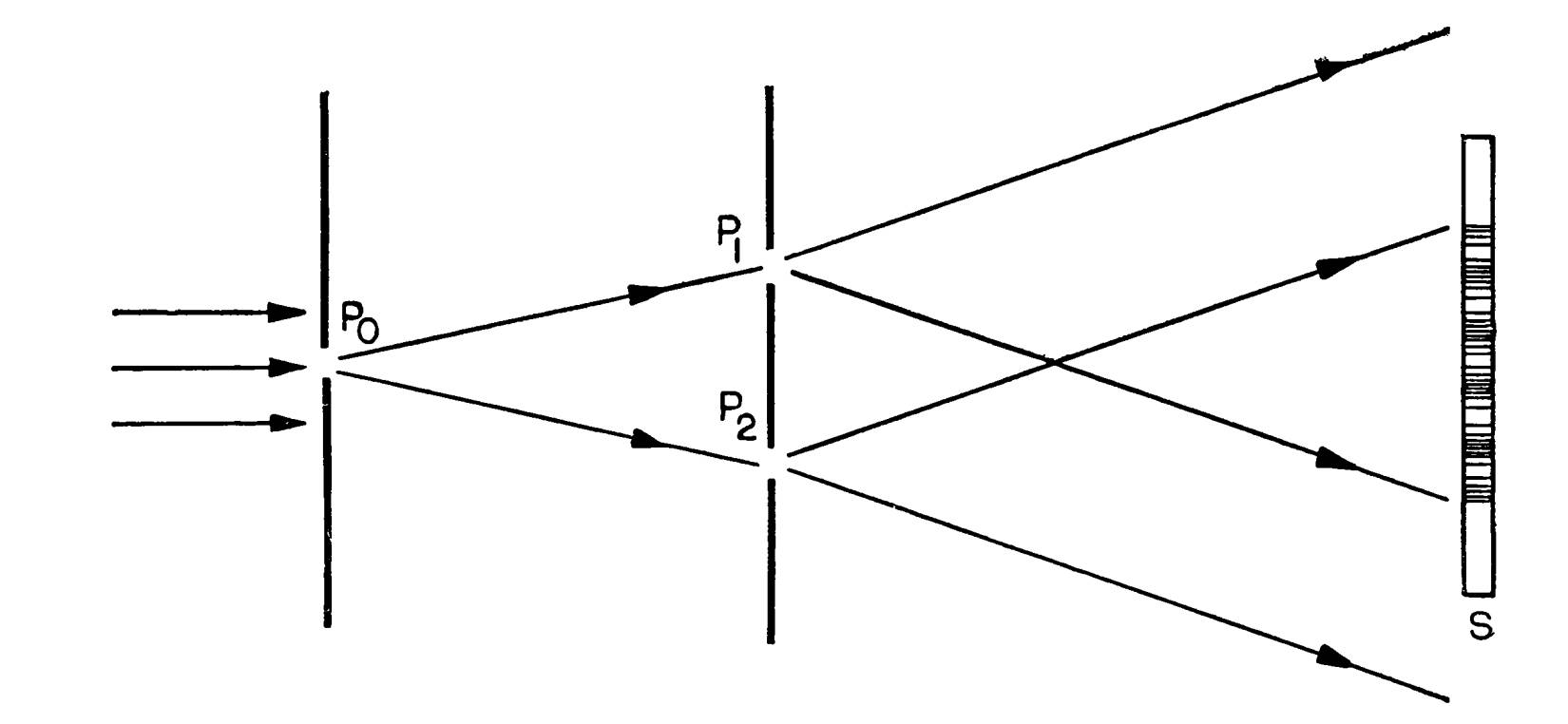 Для получения интерференции от двух световых источников экспериментальная установка Юнга имеет вид как показано на Рис.1. Точечное отверстие Р0 освещено параллельным пучком света. Сферическая волна, возникающая при дифракции на отверстии Р0, падает на расположенный на некотором расстоянии непрозрачный экран с двумя одинаковыми отверстиями P1 и Р2. Эти отверстия вырезают небольшие участки волнового фронта, в результате образуются две вторичные согласованные по фазе сферические волны. Получается, что на экране S, который помещен параллельно первому экрану, в том месте, где волны перекрываются, наблюдаются чередующиеся светлые и темные интерференционные полосы [19].