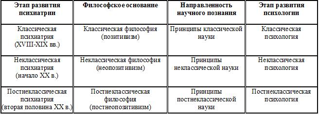 В период становления психиатрической науки все научные дисциплины основывались на единственно возможных в то время принципах и мировоззрении позитивизма. Поэтому психиатрия как наука зарождалась на основе гносеологических представлений классической науки, стремящихся к такой системе знаний, которая фиксирует истину в окончательном виде и рассматривает их как эталон науки.