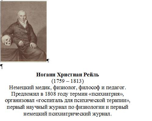 Появление термина «психиатрия» обязывало определить официальный статус этой вновь образованной дисциплины. Автор этого термина Иоганн Христиан Рейль определял его как «лечение душевных болезней», а основоположник научной психиатрии В. Гризингер – как «учение о распознавании и лечении психических болезней».