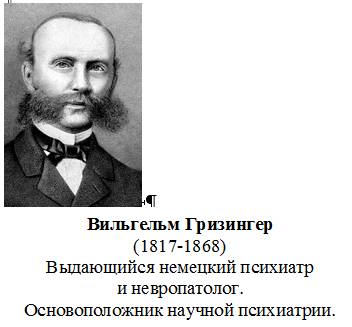 Вильгельм Гризингер в XIX веке был ярким представителем соматической школы в психиатрии и сторонником слияния невропатологии и психиатрии – мысль по тем временам прогрессивная, так как неврология входила в состав внутренней медицины, а психиатрия «ютилась» в домах умалишенных. В 1845 году вышла его работа «Патология и терапия психических болезней», составившая эпоху в психиатрии и переведенная почти на все европейские языки, явившаяся основанием считать Вильгельма Гризингера, основоположником научной и клинической психиатрии, заложившим фундамент современной психиатрии как естественнонаучной дисциплины медико-биологического профиля, базирующейся на принципах позитивистской науки.