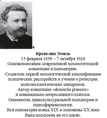 содержатся в фундаментальных учебниках, написанных выдающимися немецкими психиатрами: Эмиль Крепелин – «Психиатрия» – 1910; Карл Ясперс – «Общая психопатология» – 1913; Курт Шнайдер – «Клиническая психопатология» – 1920.