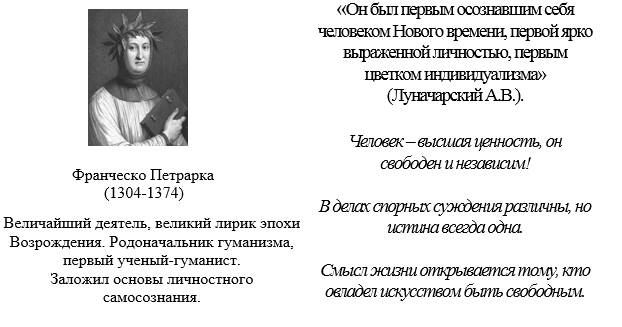 1-й этап – гуманистическая мысль эпохи Возрождения. Вторая половина ХIV века, Флорентийская республика – Франческо Петрарка (1304-1374), Джованни Бокаччо (1313-1375), Колюччо Салютати (1331-1406), Леонардо Бруни (1370-1444) подлинные родоначальники гуманизма эпохи Возрождения.