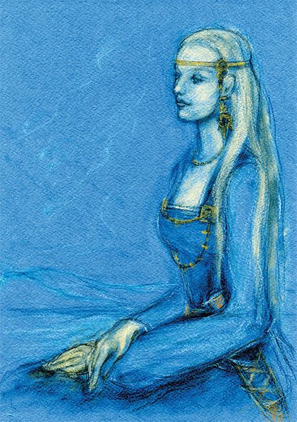 И на это Снуфри согласился, и передали слуги сватам его последнее условие. На рассвете, не простившись, уехали сваты в обратный путь к далекому острову на темной Олонке-реке. И вот наступил день, когда снова вырастает вдали парус «Змея». То сваты везут дар Хельги. Любил ярл свою дочь. Не хотел Снуфри отпускать ее от себя. Надеялся он, что не сможет жених прислать подарок для Хельги дороже привезенного раньше. Велел Снуфри, чтобы шла сама Хельги встречать гостей и посмотреть подарок. Но ошибся ярл. Вышла Хельги на пристань и ступила на палубу «Змея». Поклонились ей сваты. Видит она, что ничем не загружен корабль: нет на нем ни мехов многоценных, ни парчи серебристой, ни красного бархата, ни серебра. Тогда спросила она, что привезли они на этот раз? Бьорн Тихий на эти слова еще раз ей поклонился и подал ей шкатулочку из кости слоновой, работы тонкой, греческой. Открыла дочь ярла шкатулку, и глаза её засияли от восторга. Не смогла она удержаться, и примеряла колечко из той шкатулки на палец. Как живые, оплели его золотые змейки, а алмаз загорелся чудным светом. И как живой представился ей юноша с длинными льняными волосами и глазами такого же цвета, как у нее самой, – цвета неба. Сразу поняла Хельги, что пришёл её час проститься с отчим домом, и не может противиться она своей судьбе, потому что не может противиться любви ни один смертный. Больше ни о чем не могла она думать – так сбылось заклятие старого шамана Карво.