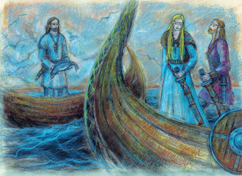 – Кирппу, бедный сиротинка,Знаю я твою заботу,Ту, что день твой омрачает,Ту, что сон ночами гонит.Много говорить не буду,Зря волной плескать не стану.Лишь хочу сказать я вот что:Выдать тайну я не вправе —То запрет великий Укко,Лучезарного владыки, —Лишь одно тебе скажу я,Знай, что день уже тот близокБлагородного отмщенья.Знай еще, что помогу яВсеми силами своими,Если ты меня разбудишь,На врагов своих укажешь.Скоро ты их опознаешьПо приметам достоверным,Доказательствам крепчайшим.Так решил великий Укко!Тут голос стих, и волна откатилась. С того дня совсем потерял покой Кирппу. Но вот прошла неделя, закончилась другая. И стало казаться юноше, что все это ему лишь приснилось, от горя показалось. Вот отправился он, как обычно, проверить сети. Благосклонна к нему была Ладога. Много жирного сига и быстрого судака попало в сети его. Поставил парус Кирппу и с богатым уловом направил лодку свою к устью реки Тулоксы, туда, где его жилище было. Вечер был тихий, и спокойна была Ладога. Вдруг видит Кирппу, как будто парус показался на горизонте со стороны заката. И верно, это был парус. Да не один, а два драккара всё ближе и ближе нагоняли лодку Кирппу. Опустил Кирппу парус свой, захотелось посмотреть ему, что за люди там едут, а заодно и рыбу продать, если она нужна путникам, ведь не надо столько ему. Вот уж близко совсем корабли подплывают, и люди с них Кирппу машут, к себе зовут. Не испугался Кирппу, стал на веслах подгребать к первому драккару. Видно было, что там не иначе как норвеги. И точно, на первом всё люди знакомые, все те, что однажды гостили у отца его, Карво, кроме самого Ингви. На корме же дракара башенка из резного дерева стоит, да такой работы, что Кирппу залюбовался. Вот из башенки той дева выходит. Глаза у нее голубые, а волосы, точно колос ячменный. Увидела дева Кирппу и, как мак, покраснела. Покраснела и отвернулась и у Бьорна Тихого о чем-то спросила. А спросила она, не жених ли её это, потому что видела она юношу этого в сердце своем с того самого часа, когда надела на палец подарок Ингви – кольцо золотое. На втором же драккаре люди все незнакомые, их числом с три десятка. Только Кирпу туда не смотрел, всё глаз не мог отвести от девы норвежской. Тут и говорит ему Бьорн Тихий: