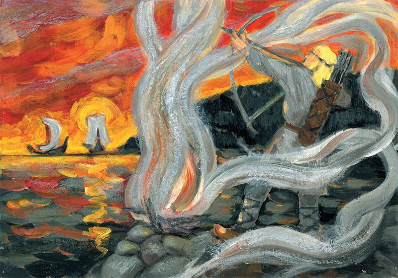И на то согласились викинги, потому что не хотелось ночной порой грести им по темной воде Олонки-реки. Так решили они бросить якоря и ночевать здесь, а заодно дождаться Кирппу с уловом лососей. Тут погреб Кирппу к Черному мысу, а сам всё не мог глаз отвести от Хельги. И хоть был рядом жених ее, Ингви, печаль сжимала сердце ее. Не лежала её душа к нему, а влюбилась она в юного рыбака с льняными волосами и глазами цвета синего неба. Потому-то смотрела она на Ингви и не видела, и те слова, что он ей говорил, не слышала. Тем временем догреб Кирппу до Черного мыса, до камня, где когда-то разговаривал с духами его отец. Не мешкая, развёл он огонь на камне том, сам выстрогал две стрелы, а на каждой стреле вырезал по магической руне. И руна на первой означала «Проснись и внимай», а на второй – «Месть». Кремнёвый наконечник вставил он в каждую, перьями гуся он их оперил. Вот начинает нагревать на огне Кирппу наконечник первой стрелы. А когда раскалился он, то пустил юноша стрелу прямо в Ладогу, в черные, ночные воды. Зашипел в волнах раскаленный кремень, и вздрогнула от укола стрелы Ладога, всколыхнулась она от жара камня: