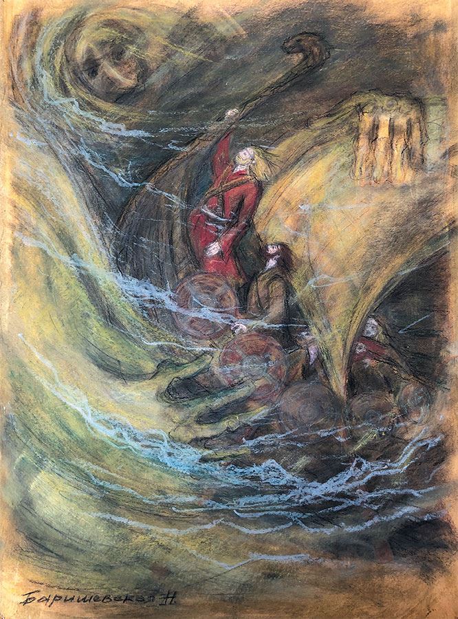 Как услышал Кирппу, что ответила ему Ладога, взял он вторую стрелу с руной, что месть обозначала. Взял и раскалил кремневый наконечник над огнем, и горело сердце его. Вот натянул он тетиву лука и послал вторую стрелу в сторону кораблей. И случилось чудо: только лишь коснулся горячий кремень ладожской волны, как взвилась она разъяренной рысью! Братья Ладоги – ветры быстрые – зашумели-заревели, слетаясь с четырех сторон света. Огромная волна подхватила первый драккар, как нитки, порвала якорные канаты и со страшной силой ударила его о камни на Черном мысу, да так, что резная башенка, где Хельги спала, отломилась и осталась лежать на прибрежных камнях. Волна же стащила треснувший драккар подальше от берега и, как кошка с мышкой, принялась играть с тонущим кораблём. Кто за что мог уцепились викинги, и молили они своих богов о спасении. Но пришел их последний час, пришла расплата за бесчестное убийство.