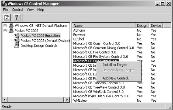 ♦ В левой части окна выбрать устройство, на которое будет осуществляться поставка приложения (на рисунке это Pocket PC 2002 Emulation). В правой части окна нужно найти библиотеку, которую необходимо установить и зарегистрировать (на рисунке выбрана библиотека Microsoft CE Grid Control). На имени библиотеки нужно щелкнуть правой кнопкой мыши и выполнить команду контекстного меню Install to Target. Библиотека будет установлена и зарегистрирована.