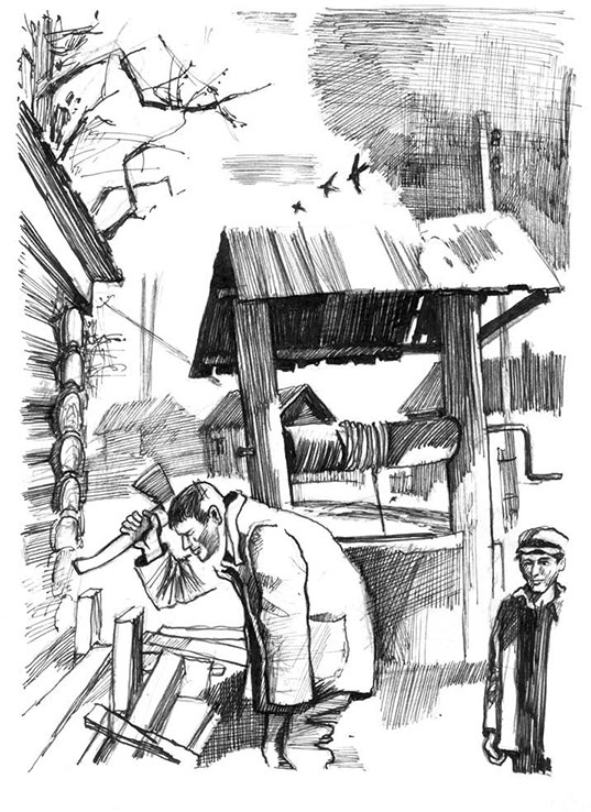 И другая жизнь пошла в доме: запахло махоркой, резиновым клеем; рыбачьи иголки появились на столе, молоток, рашпиль… На следующее утро отец надел довоенный пиджак, фуфайку и ушёл на улицу. Он долго ходил возле дома, брал в руку то молоток, то клещи, то топор… Всё начинал что-то делать – стукал, тесал, но тут же бросал, брался за другое… за третье.