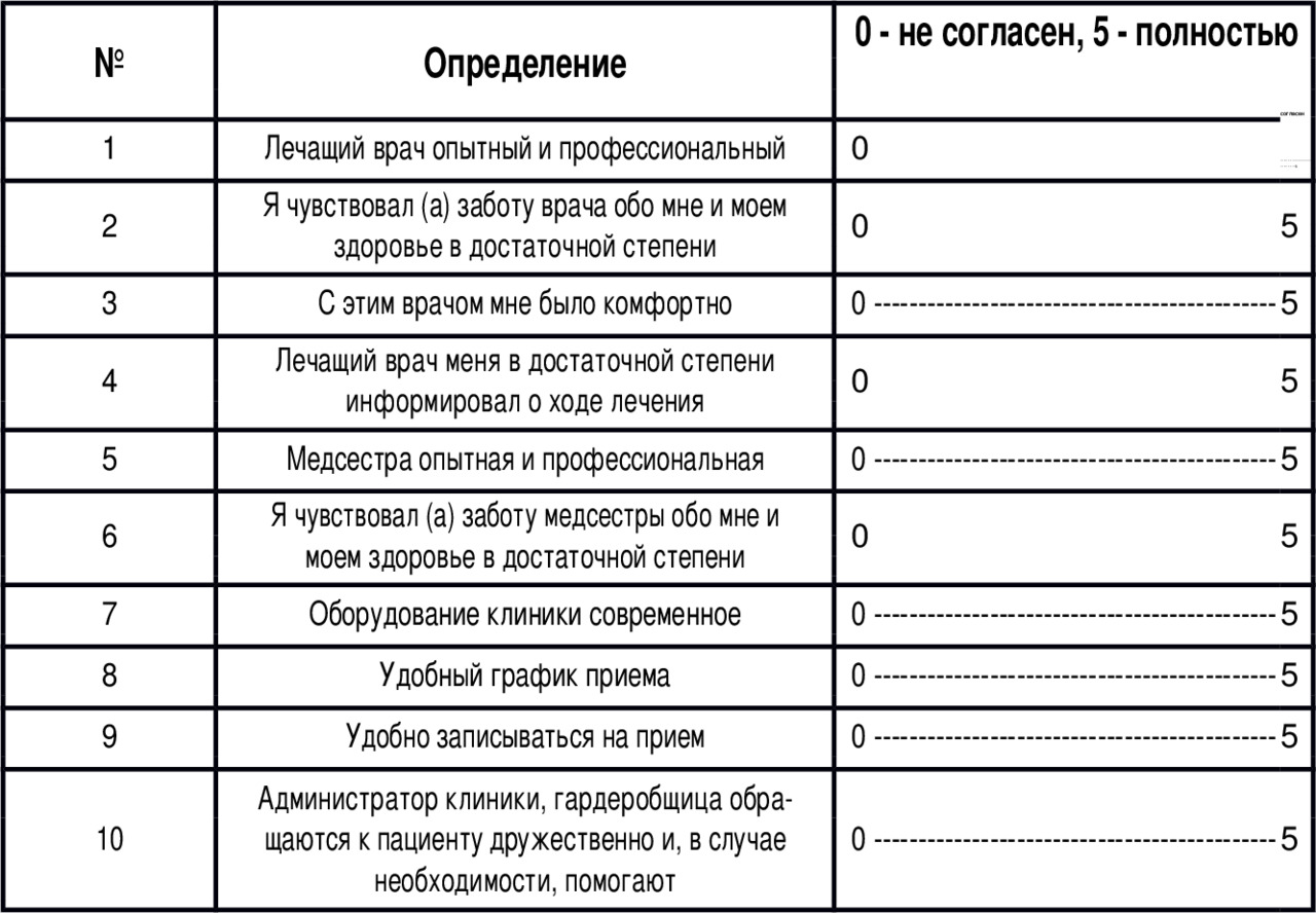2) После того, как врач дал рекомендации по профилактике заболевания и назначил рекомендованную дату профилактического осмотра, пациенту выдается анкета обратной связи клиники. В анкете последним обязательным вопросом должен быть вопрос: «Оцените, пожалуйста, по 5-ти бальной шкале вашу готовность порекомендовать нашу клинику вашим близким и родным. (Где 0 – это точно не порекомендую, 5 – обязательно порекомендую)