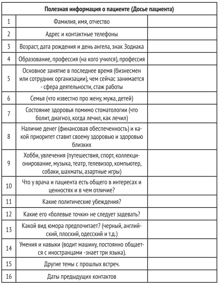3—5 минут «ДО» и 3—5 минут «ПОСЛЕ» консультации – общение с постоянным пациентом должно быть на отвлеченные темы (семья, работа, дети, увлечения, погода, пробки и т. д.) для поддержания приятельских отношений между врачем и пациентом.