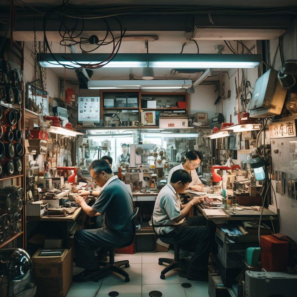 (Мастерская по ремонту телефонов. Владелец Чан, 2–4 рабочих за столами).