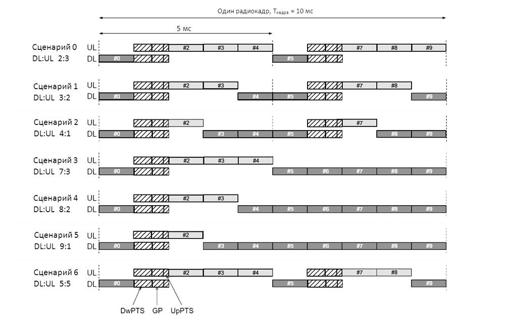 При частотном дуплексе в каждом субкадре идет одновременная передача вверх (UL) и вниз (DL) в разных частотных полосах. При временном дуплексе в некоторых субкадрах идет передача вниз (D), в других вверх (U). Кроме того, есть специальные (переходные) субкадры (S), состоящие из трех полей: DwPTS – поля передачи вниз, UpPTS – поля передачи вверх и защитного интервала (GP). В сетях LTE согласно спецификациям возможны 7 конфигураций кадров при временном дуплексе (рис. 8).