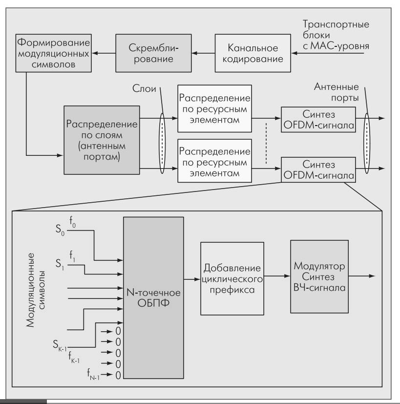 Формирование сигнала в нисходящем канале достаточно стандартно для современных систем цифровой передачи информации (рис.15). Оно включает процедуры канального кодирования, скремблирования, формирования модуляционных символов, их распределение по антенным портам и ресурсным элементам и синтез OFDM-символов. Канальное кодирование подразумевает вычисление контрольных сумм (CRC-24) для блоков данных, поступающих с МАС-уровня. Затем блоки с контрольными суммами обрабатываются посредством кодера со скоростью кодирования 1/3. В LTE предусмотрено применение либо сверточного кода, либо турбокода. Кодированная последовательность после перемежения (интерливинга) поступает в скремблер (для входной последовательности {x(i)} выполняется процедура вида dscr(i) = x(i) + c(i), где c(i) – определенная скремблирующая последовательность). Затем формируются комплексные модуляционные символы (QPSK, 16- и 64-QAM) и распределяются по ресурсным элементам. Далее происходит синтез OFDM-символов, их последовательность поступает в модулятор, формирующий выходной ВЧ-сигнал в заданном частотном диапазоне. На стороне приема все процедуры выполняются в обратном порядке.