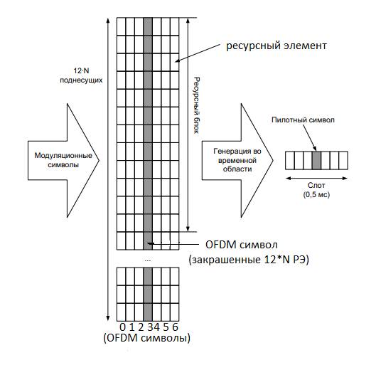 Синтез OFDM сигнала показан на рис. 15. Прежде всего следует отметить, что сформированные модуляционные символы представляют собой не реальные модуляционные сигналы, а комплексные числа, в которых вещественная часть представляет амплитуду сигнала, а мнимая – фазу. Сформированные модуляционные символы сначала распределяются по слоям (антенным портам), а внутри слоя по ресурсным элементам, входящим в состав слота (рис.16) для всех выделенных ресурсных блоков (для всех выделенных поднесущих).