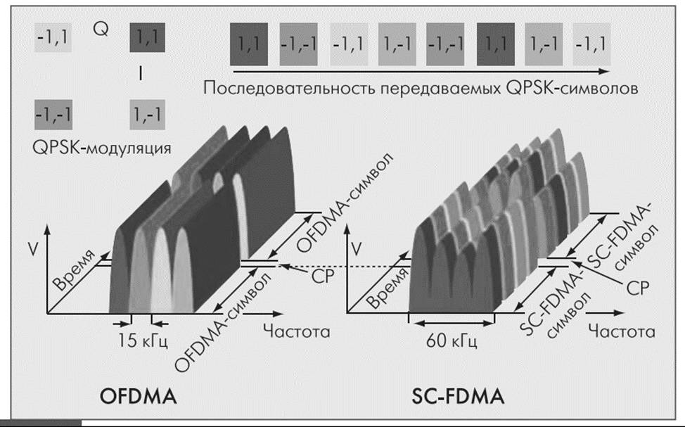 Рис. 17. Различие между OFDMA и SC-FDMA при передаче последовательности QPSK-символов