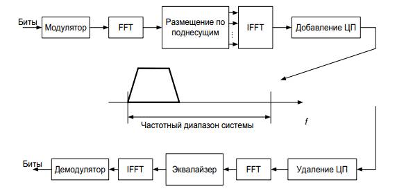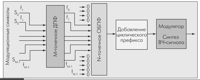 На вход блока N-точечного ОБПФ подаются OFDM сигналы, состоящий из модуляционных символов (комплексных чисел), предназначенных для всех N выделенных поднесущих, то есть отсчеты сигнала в частотной области. В результате ОБПФ на выходе получают отсчеты OFDM сигнала во временной области. Копируя часть временных отсчетов с конца OFDM сигнала в его начало добавляют так называемый циклический префикс для защиты от влияния интерференции. Однако, добавление циклического префикса, который уменьшает влияние канального затухания (link fading) и межсимвольную интерференцию (inter symbol interference), увеличивает полосу пропускания.