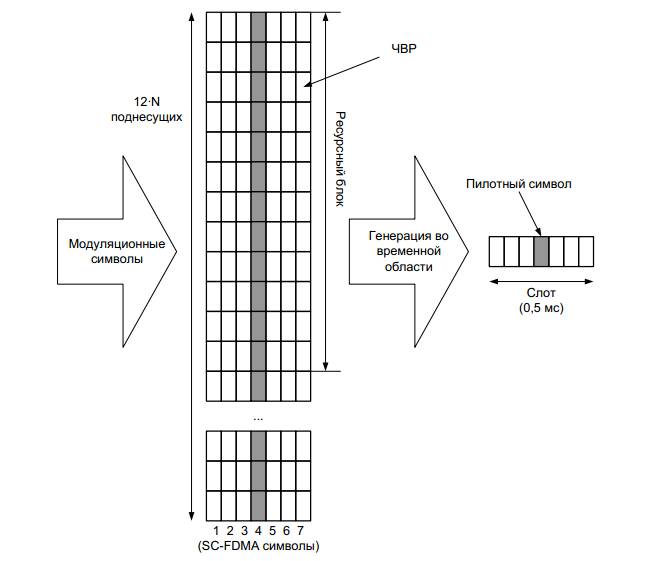 Несмотря на то, что используется схема мультиплексирования с передачей на одной несущей, при формировании такого сигнала для удобства, всё же, будем пользоваться понятием поднесущих. При формировании сигнала восходящих каналов комплексные модуляционные символы размещаются по доступным частотно-временным ресурсам (ЧВР), не занятым пилотными символами (рис. 20), где пилотные символы выделены тёмным цветом). Пилотные символы располагаются в середине слота, они используются на приемной стороне для оценки передаточной характеристики канала. После размещения данных по ЧВР генерируется SC-FDMA-сигнал с периодическим добавлением ЦП во временной области.