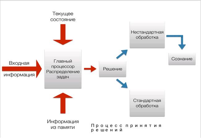 Сложный процесс, который происходит у нас в Психике можно разделить на отдельные блоки, тогда понимание общей совокупности процессов, безусловно, начнет проясняться. Требуется в очередной раз избежать ловушки сознания и не отождествлять процесс принятия решений только с сознанием. Роль сознания не столь велика, хотя и не мала, как кажется недальновидным наблюдателям. Но, если исследователь изучает только процессы, видимые сознанием, то понять работу Психики практически невозможно. Именно поэтому и сформировалось устойчивое мнение, что «голова – предмет темный, и изучению не подлежит».